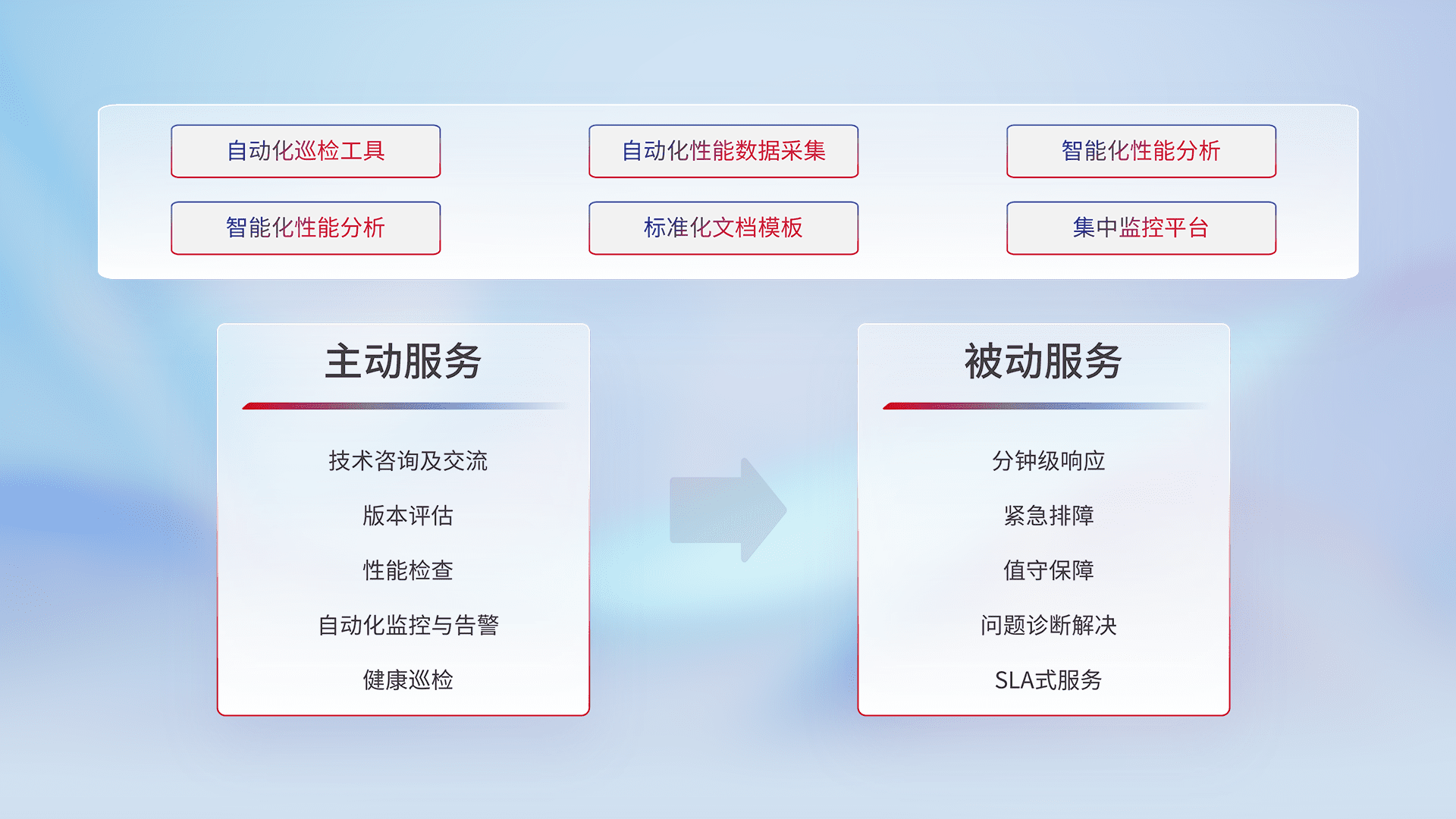 智能化工具和标准化文档,,,,保障服务质量,,,,提供主动服务(包含技术咨询、、、版本评估、、、、性能检查、、、、自动化监控与告警、、健康巡检)和被动服务包含(分钟级响应、、、、紧急排障、、、、值守保障、、、、问题诊断解决、、、、SLA服务)。。
