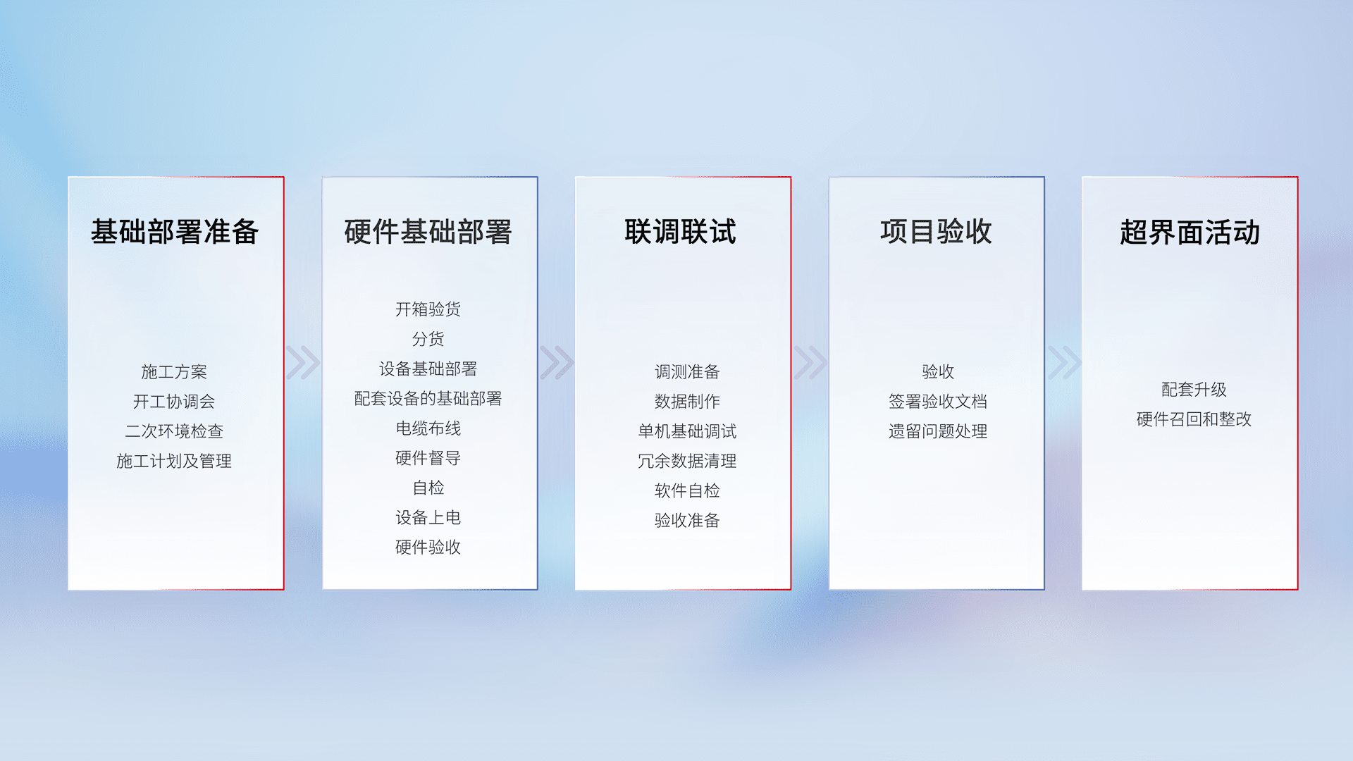 从基础部署准备、、、、硬件基础部署、、、、联调联试、、项目验收、、越界面活动的全过程可追溯,,,保证施工质量和进度。。。